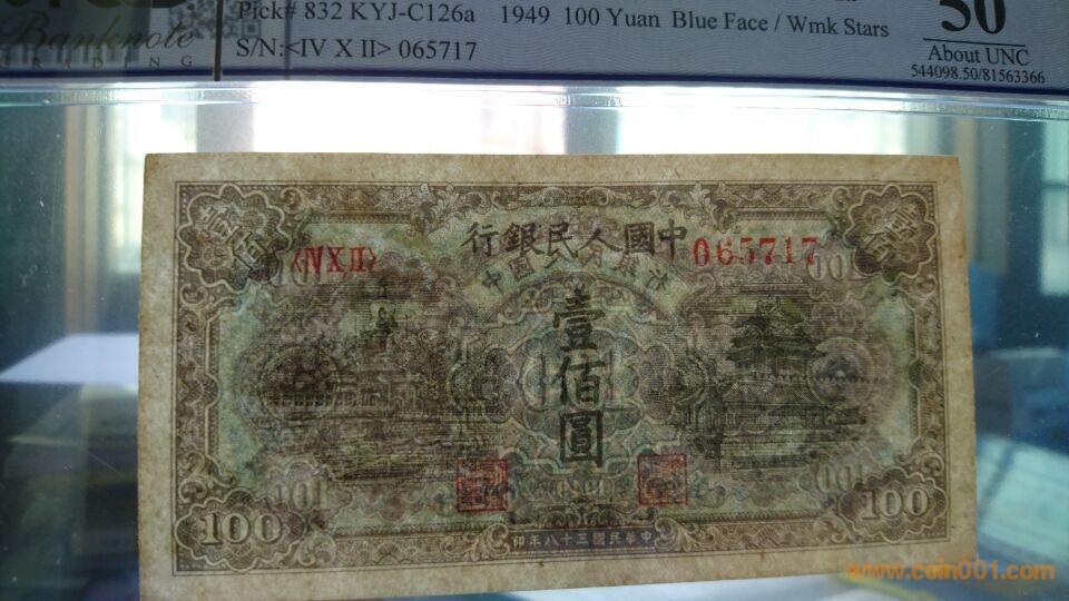 一版100元藍(lán)北海,美國(guó)PCGS評(píng)級(jí)50分,原票原味尺寸足,稀少的空心星水印版,難入殼品種,目前總評(píng)量100多張。藍(lán)黑色油墨濃厚,圖案精美細(xì)節(jié)紋路清晰,立體感強(qiáng),好號(hào)全程無4,號(hào)碼065717。