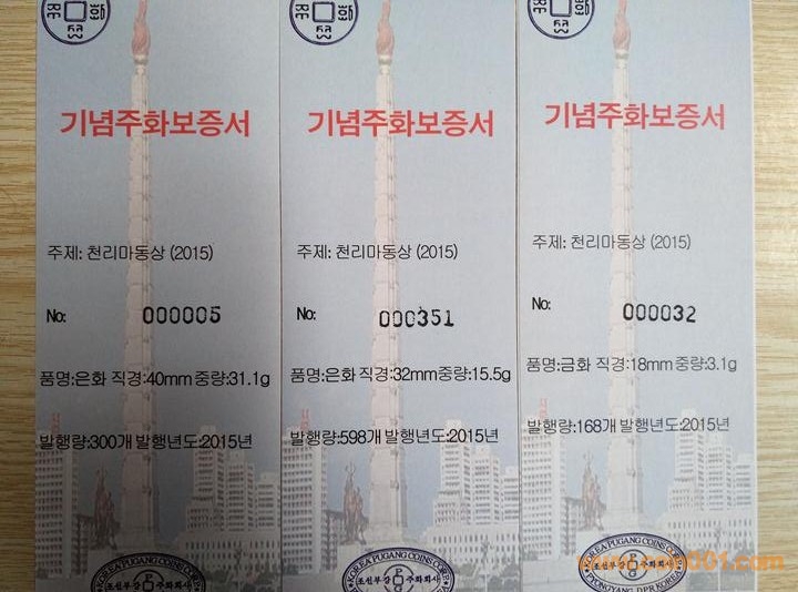 1,出一套朝鮮首年投資金銀幣2015年千里馬,官方套裝盒幣含十分之一金幣、一盎司銀幣、半盎司銀幣、銅幣、鋁幣各一枚,價(jià)格3000。