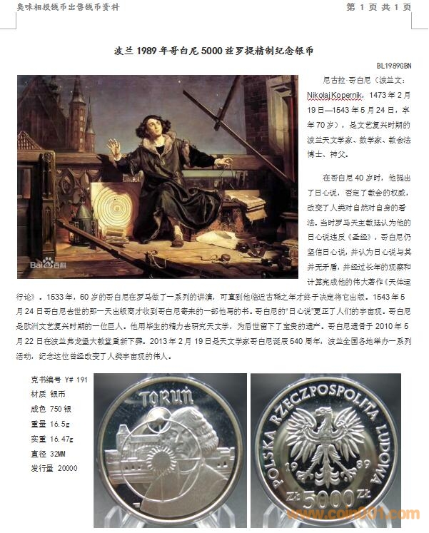 波蘭1989年哥白尼5000茲 ..