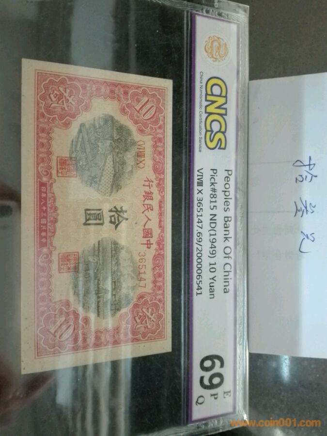 第一版人民幣拾元鋸木犁田,號碼365147,華龍評級69epq,橫波紋水印。價格3000。