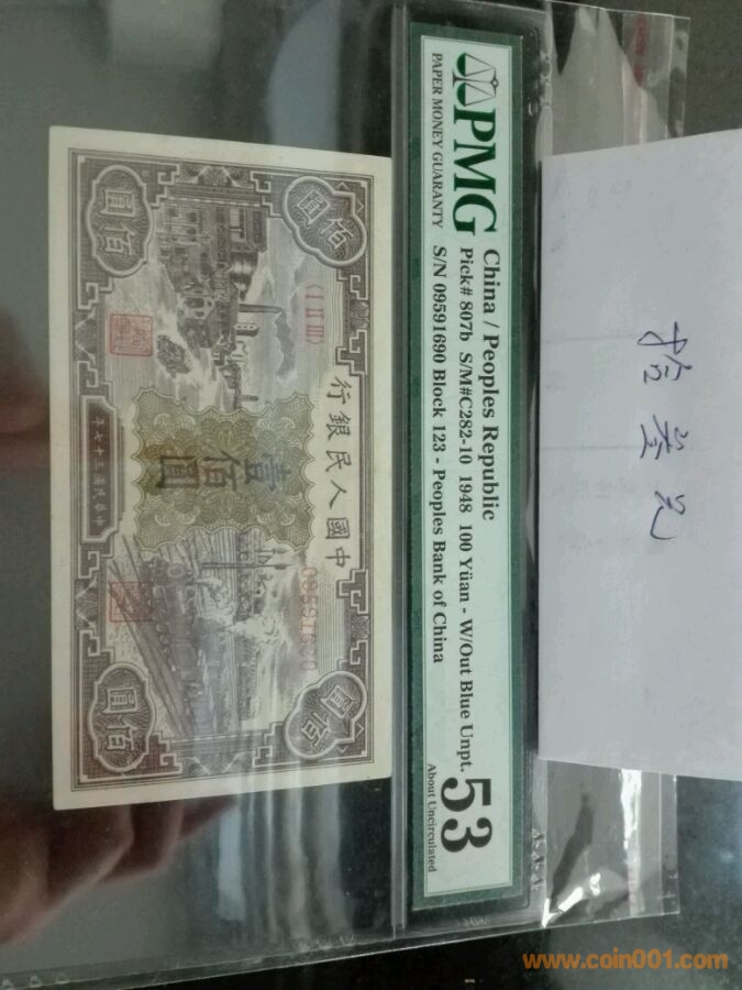 第一版人民幣一百元黑工廠,號碼09591630,pmg53。一版幣極難入盒品種。價格7900。(已出)