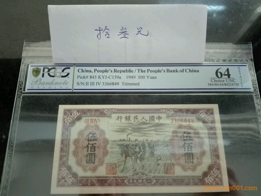 第一版人民幣五百元種地,號碼3366849,pcgs64,價格13000。