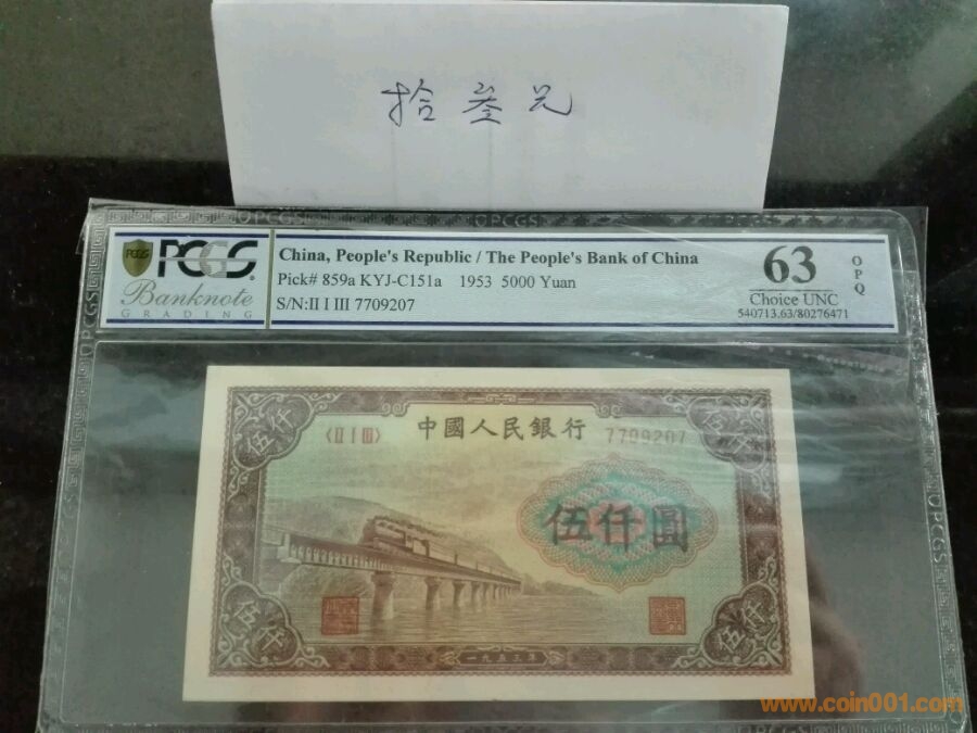 第一版人民幣人民幣五千元渭河橋,pcgs63opq,號碼7709207,價格29000。