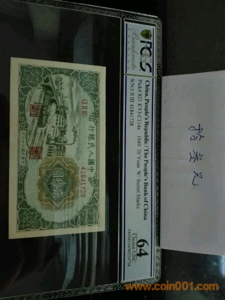 第一版人民幣二十元立交橋,號碼41841728 ,pcgs64,價格3000。