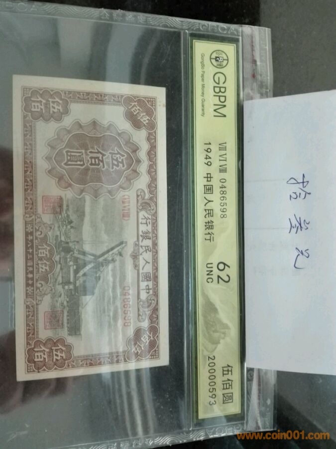 第一版人民幣五百元起重機,號碼0486598,公博評級62,價格5800。