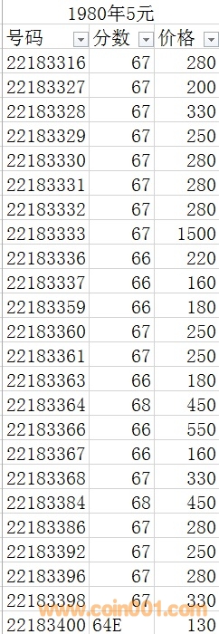 1980年5元,號(hào)碼:22183330  67分;