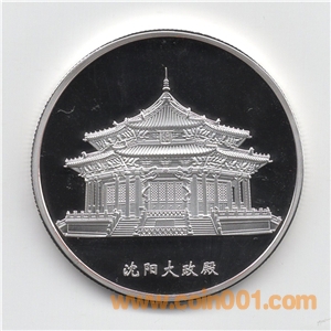 紀(jì)念章正面分別為清朝十二位帝王正面像,配以文字,生成年月及印章。背面為沈陽故宮中的標(biāo)志性建筑“大政殿”。