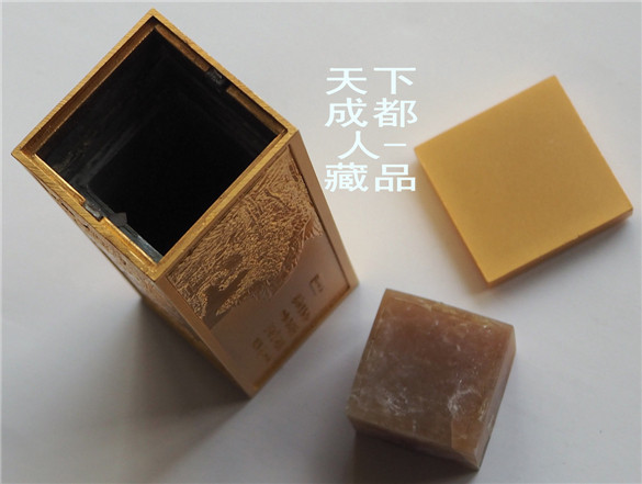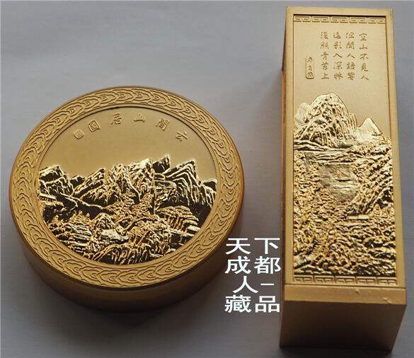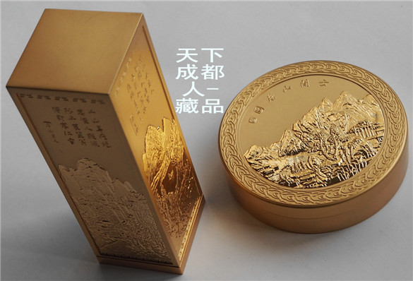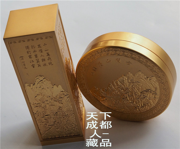高雅文房用品套件:浮雕版《金屬鍍金-私*章印泥精制山水詩(shī)詞禮盒》一組2件;該私*章印泥套盒采用浮雕鍍金制作工藝,長(zhǎng)形私*章長(zhǎng)寬91*30毫米(底座附1枚刻*章石寬24毫米、厚20毫米),印泥盒直徑63毫米。私*章印泥精制山水詩(shī)詞禮盒均沒(méi)使用,外觀高端風(fēng)雅。