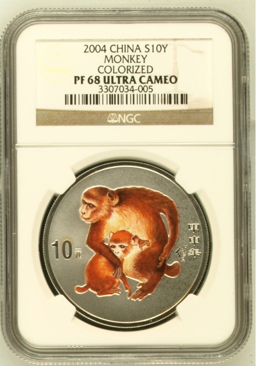 NGC評(píng)級(jí)PF68UC 2004年1盎司猴年生肖彩色紀(jì)念銀幣 ,1860元(枚)惠讓給喜歡的朋友。順風(fēng)包郵;如需走中介費(fèi)用買(mǎi)家付。不常在線,請(qǐng)手機(jī)短信聯(lián)系,以我確認(rèn)為準(zhǔn)。