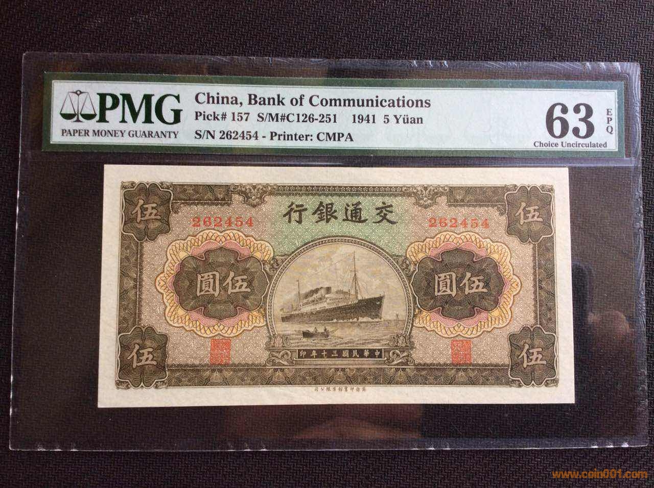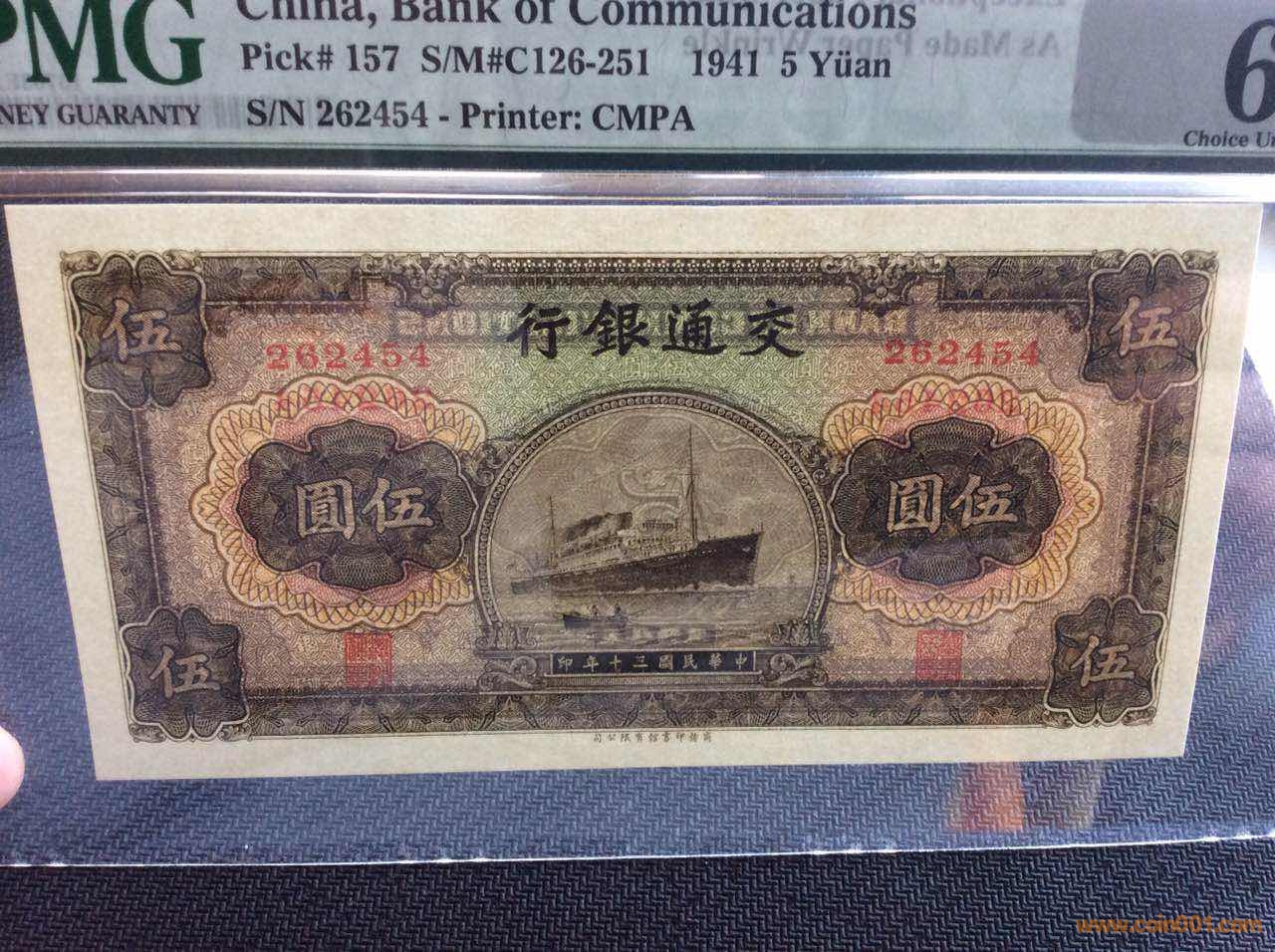 1941年商務(wù)版交通銀行伍圓輪船,采用凹版印刷。全新原票未流通無人為處理(63E),正面下方商務(wù)印書館字樣左側(cè)鈔紙帶造紙過程形成皺紋(詳見圖3),是該票扣分原因,標(biāo)簽背面有標(biāo)注Exceptional paper quality as made paper wrinkle.