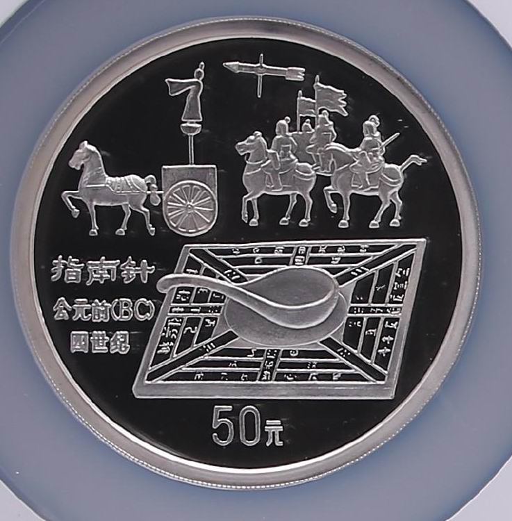 那么在其余的銀幣當(dāng)中還有沒有能夠評上五星級而被低估的呢?比如12盎司銀鄭成功,或者公斤銀齊白石,相信大家都有心目中的答案。而我今天要說的這枚銀幣是一枚隱藏的大珍,市場難覓芳容,星級榜也未見其蹤影。它就是:指南針5盎司銀幣山字版。