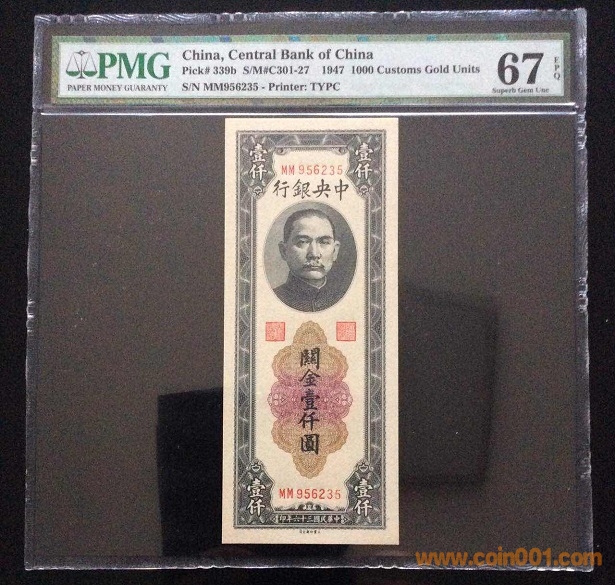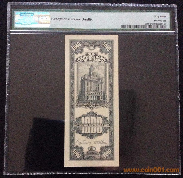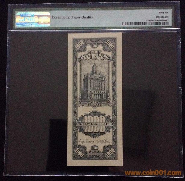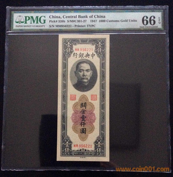 9、中央銀行1000元關(guān)金(1947年) PMG66E 956221# ¥880