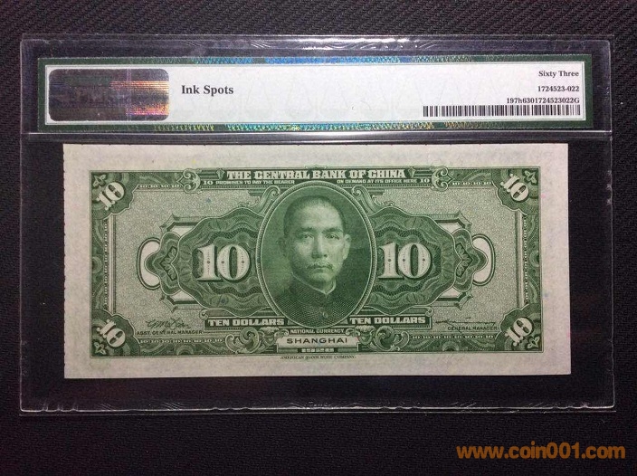 7、中央銀行10元加蓋上海地名(1928年) PMG63 182633# ¥260 注:趣味鈔,裁切跑偏鈔紙有印刷色標(biāo),評級標(biāo)簽有備注