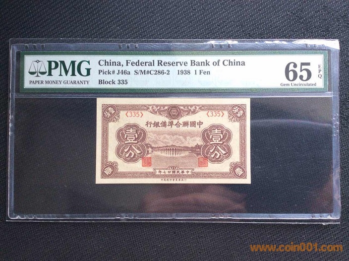 1、中國聯(lián)合準(zhǔn)備銀行1分(1937年) PMG65E 335# ¥368