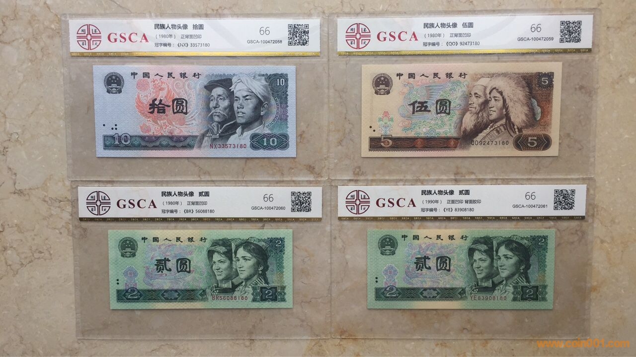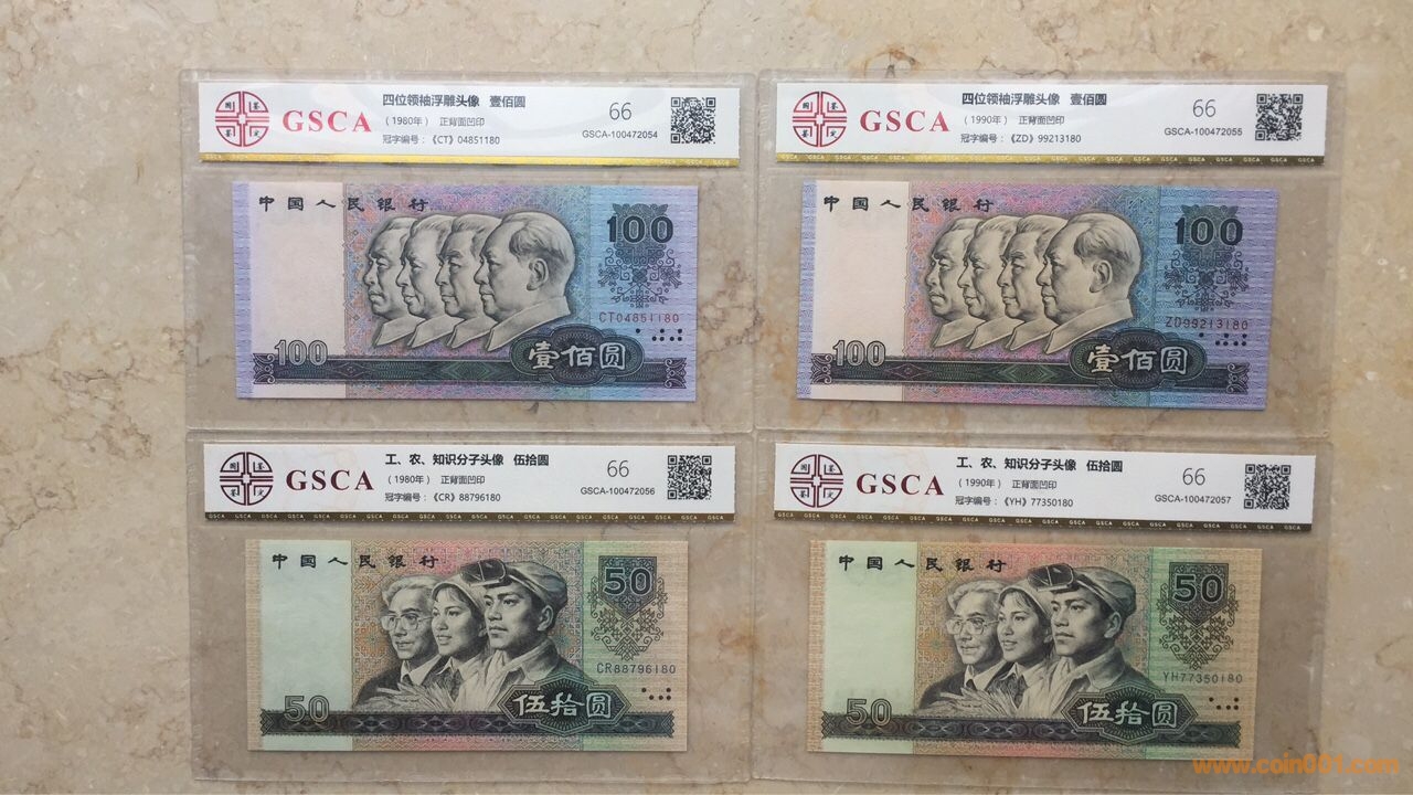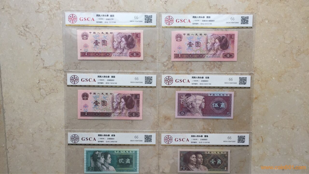 1)80版+90版100元劵各一枚;(2)80版+90版50元劵各一枚;80版50元(第四人*民*幣鈔王,罕見)(3)80版10元劵一枚;(4)80版5元劵一枚;(5)80版+90版2元劵各一枚;(6)80版+90版+96版1元劵各一枚;(7)80版五角劵一枚;(8)80版兩角劵一枚;(9)80版一角劵一枚;最大特點:中國人民銀行發(fā)行的第四套人*民*幣全套九種劵別“末三位”數(shù)字編號全部相同