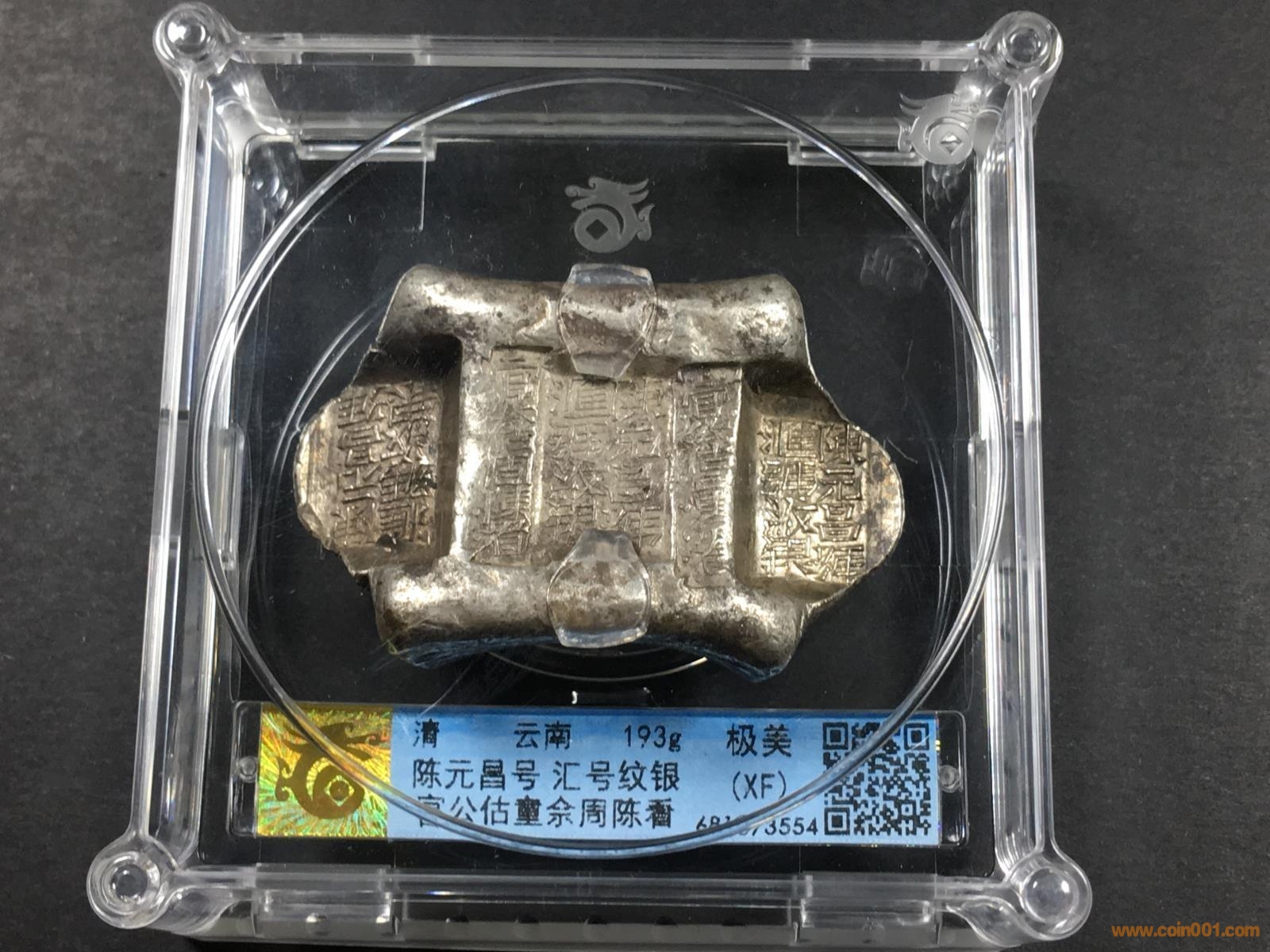 圖片:LOT 10 清代 云南牌坊錠 華夏評(píng)級(jí) 極美XF 陳元昌號(hào) 匯號(hào)紋銀 官公估童佘周陳看 重193g  評(píng)級(jí)編號(hào)681073554 (1).JPG
