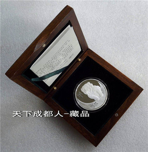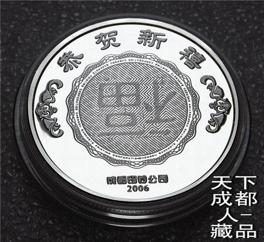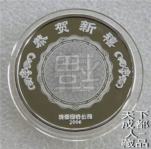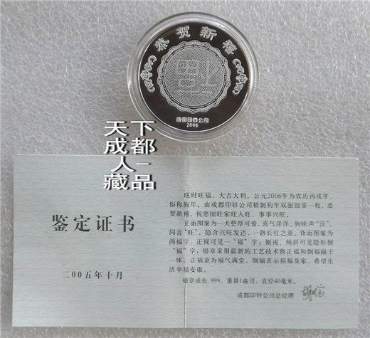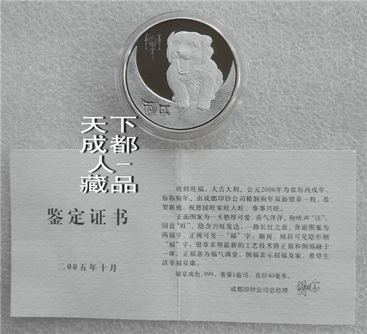 生肖防偽本銀章:中國(guó)印鈔造幣總公司成都印鈔公司鑄造發(fā)行《2006年生肖狗純銀(雙面防偽精制)紀(jì)念章》原盒證1枚裝;材質(zhì)純銀、采用“四重潛影高端防偽”鑄造技術(shù)、雙面精制帶齒邊工藝、重量一盎司、成色99.9%、直徑40毫米、鑄造量不詳;成鈔司原木質(zhì)盒內(nèi)塑盒精美包裝,隨附帶水印鑒定證書(shū)1份。