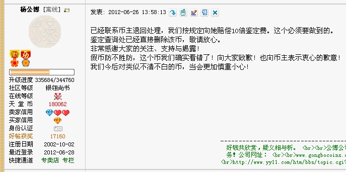 引用 引用第2樓littlewoodz于2012-06-28 23:01發(fā)表的 :NGC和PCGS是否有承認不清楚,不過,最好不要局限在一個天堂來看,多看看美國和歐洲,因為在天堂,我就沒看到過一個真正因假而索賠的人來介紹索賠始末。連一個實例都沒有,真的很難說。估計歐洲和美國肯定有實例,多逛逛他們的論壇,估計有答案。