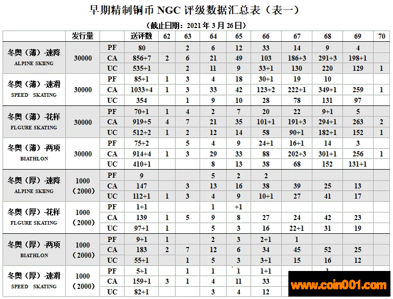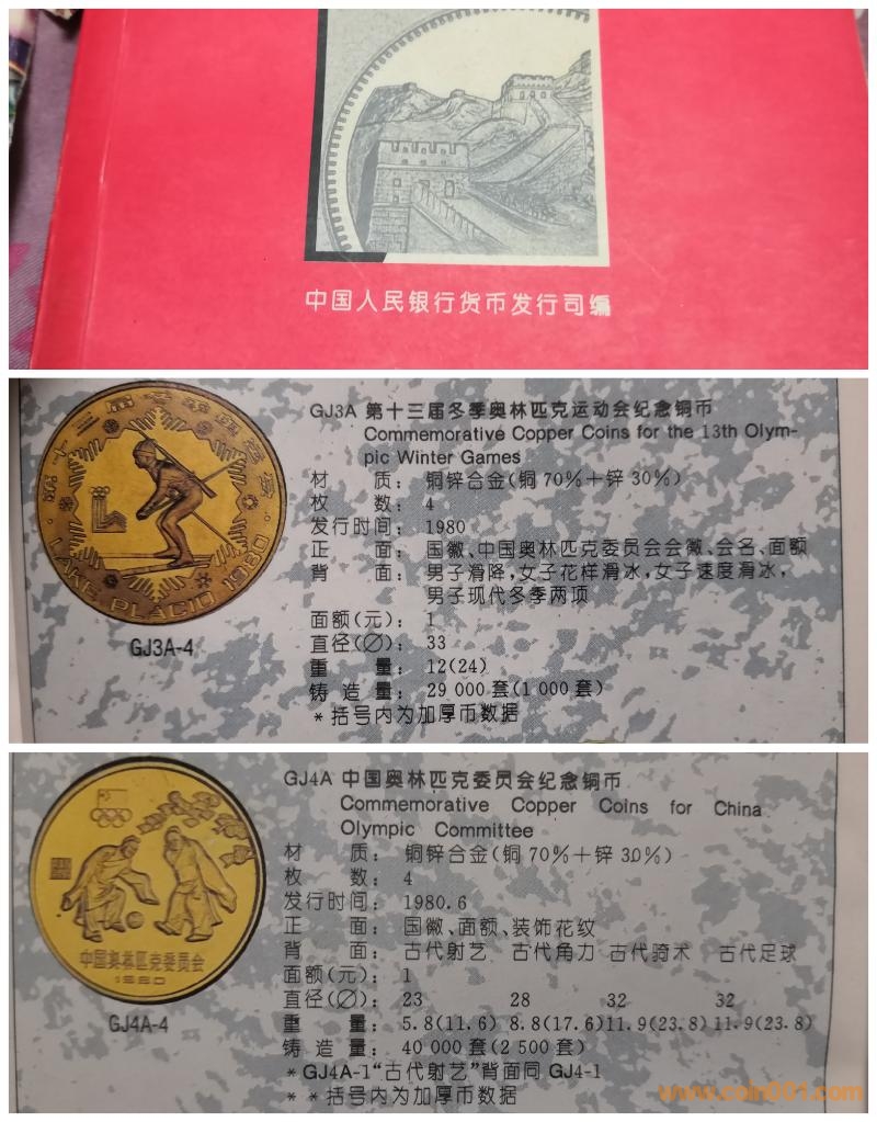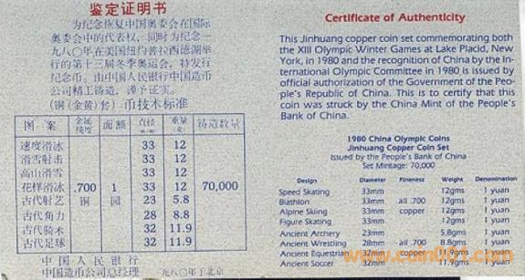 新中國第一組體育幣是1980年為紀(jì)念我國第一次參加美國紐約普拉西德湖第13屆冬奧會而發(fā)行的。該屆冬奧會頭號新聞人物是美國男子速滑運(yùn)動員海登,冬奧史上獨(dú)一無二地囊括了全部5個速滑項(xiàng)目的金牌,被授予第13屆冬奧會杰出運(yùn)動員的光榮稱號。該屆冬奧會我國共派出28位男女運(yùn)動員參加了滑冰、滑雪、現(xiàn)代冬季兩項(xiàng)的18個單項(xiàng)比賽,無一人進(jìn)入前六名。薄幣品種有一金一銀四銅,其中金幣的圖案為男子滑降,雪花環(huán)繞的設(shè)計(jì)曾獲得一致好評,不過有紀(jì)念海登之嫌,計(jì)劃發(fā)行量20000枚(而該屆冬奧會主辦國美國居然未發(fā)行貴金屬紀(jì)念幣),因?yàn)橐凿N定產(chǎn)的原因,實(shí)際鑄制了10143枚,中文證書無號碼,白紙藍(lán)底,由時任中國造幣總公司總經(jīng)理?xiàng)畋灠l(fā)。一枚銀幣的圖案為女子速度滑冰,計(jì)劃發(fā)行量5000枚。四枚銅幣的圖案分別為女子花樣滑冰、女子速度滑冰、男子滑降和男子現(xiàn)代冬季兩項(xiàng),計(jì)劃發(fā)行量70000枚,實(shí)際鑄制了29050枚