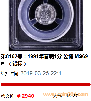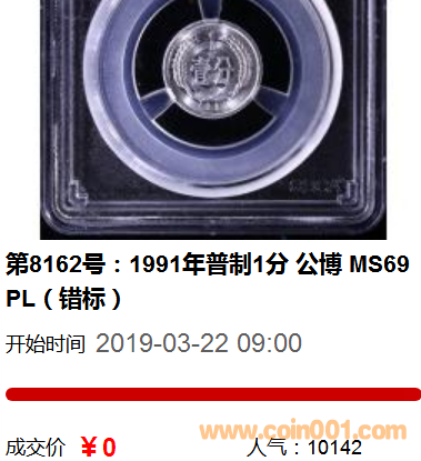 敬請關(guān)注2019年春秋大拍拍品第8162號:1991年普制1分 公博 MS69PL(錯標(biāo))