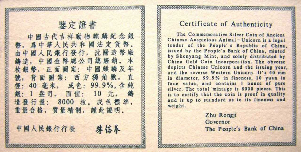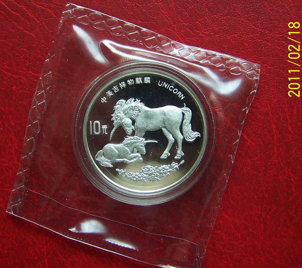 出售藏品1995中美吉祥物麒麟精制銀幣壹枚(1盎司),發(fā)行量8000枚。