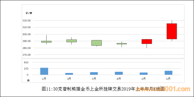 2019年上半年30克普制熊貓金幣在上金所交易的K線圖見圖11。交易數(shù)量和交易金額按單向成交量計算。