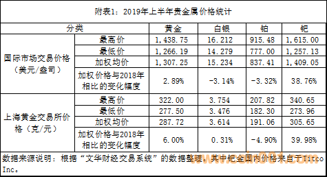 貴金屬是我國現(xiàn)代貴金屬幣的重要物質(zhì)基礎(chǔ)。2019年上半年貴金屬價格走勢與2018年的比較見附表1和圖1。