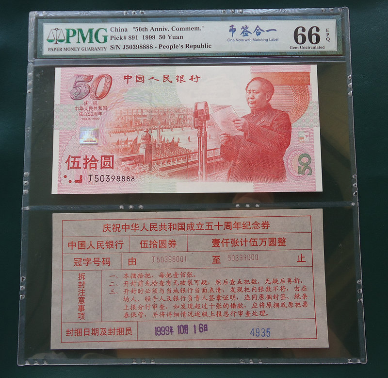 建國(guó)鈔 幣簽合一 PMG 66分 J50398888 黃金元寶版 是建國(guó)鈔唯一帶熒光的品種 惜售26800元!