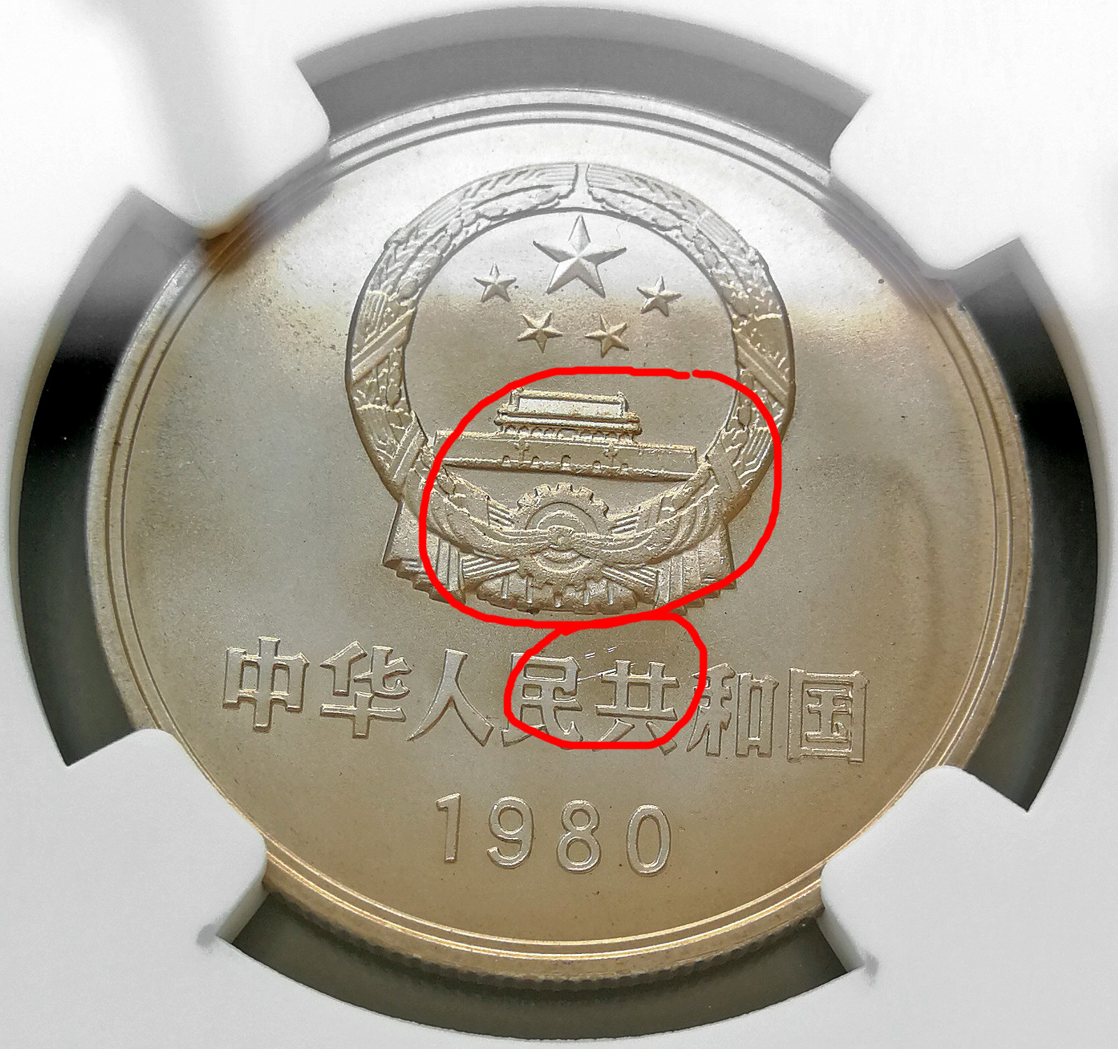 第2種幣如圖2所示,粗看也是初鑄狀態(tài),但細(xì)看就能發(fā)現(xiàn),長(zhǎng)城面和第1種幣基本無(wú)異,而國(guó)徽面存在明顯