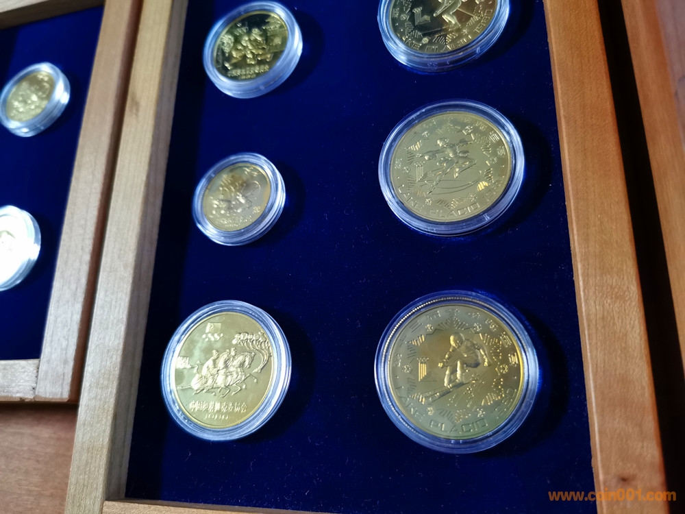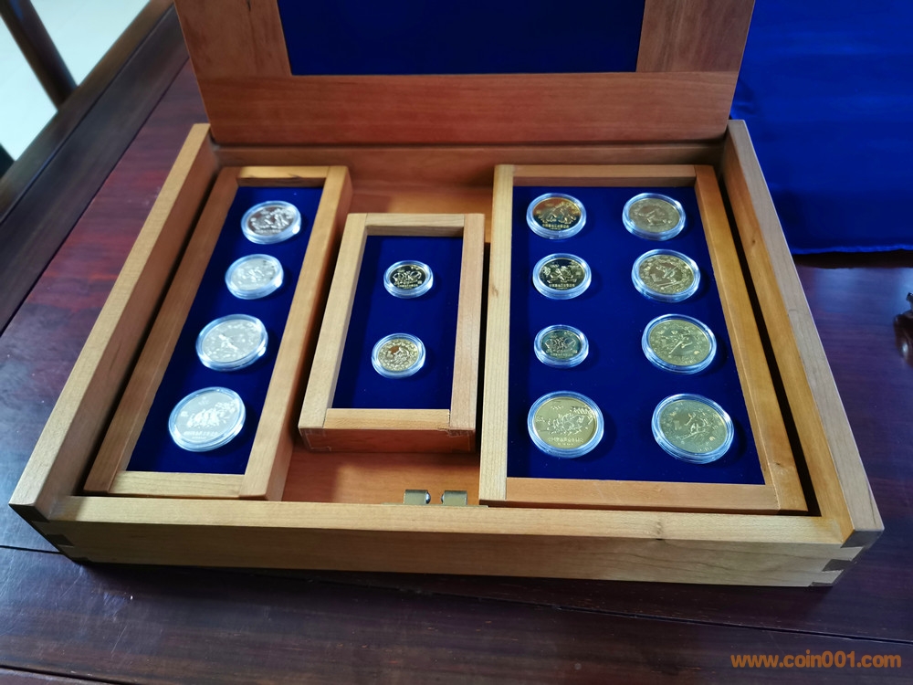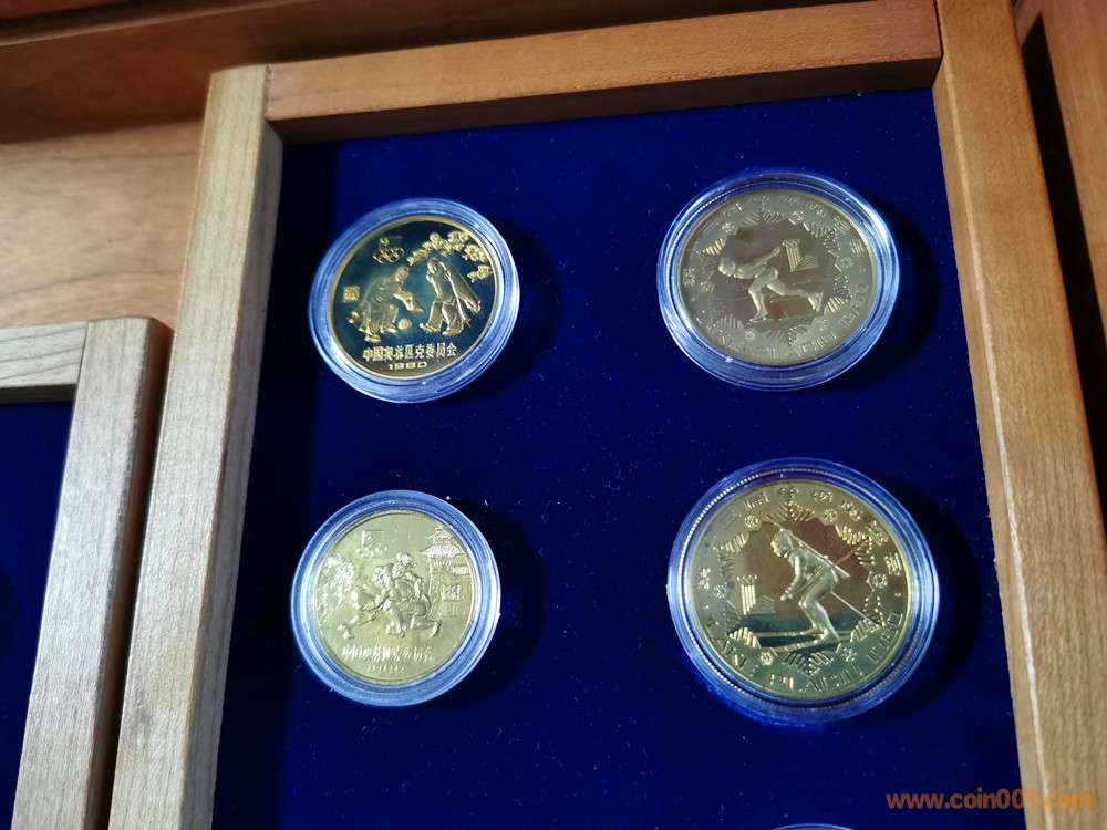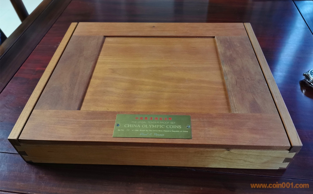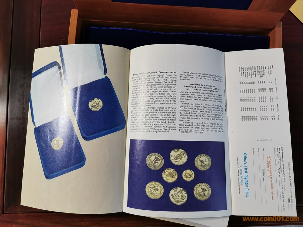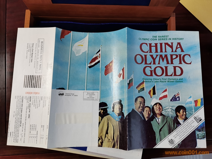 美國版證書就比較奇怪了。根據(jù)克書記載,1980年由中國造幣公司官方正式裝幀發(fā)行的中冬奧系列精制幣套裝一共有4種,一是金銀銅14枚大全套,發(fā)行量1000套。二是中奧銅幣4枚裝一套,發(fā)行量不詳。三是冬奧銅幣4枚裝一套,發(fā)行量不詳。四是中奧銀幣3枚盒裝一套,發(fā)行量1000套。并無記載有中冬奧8枚一起發(fā)行的套裝,因此這張證書存疑。