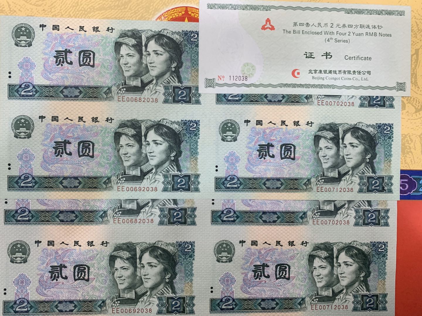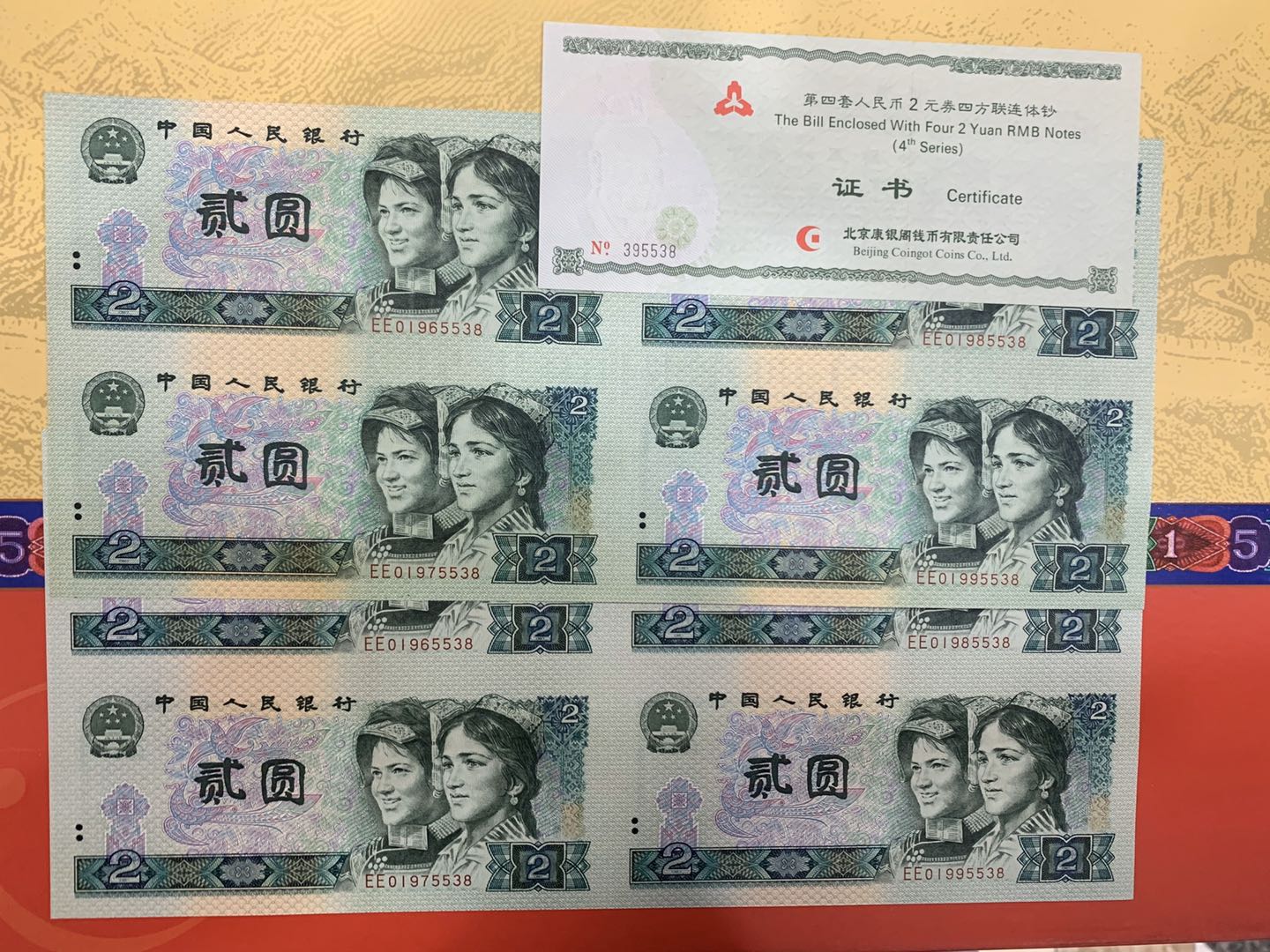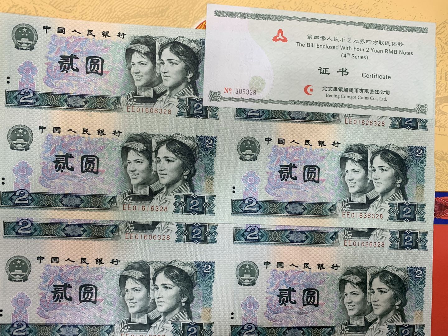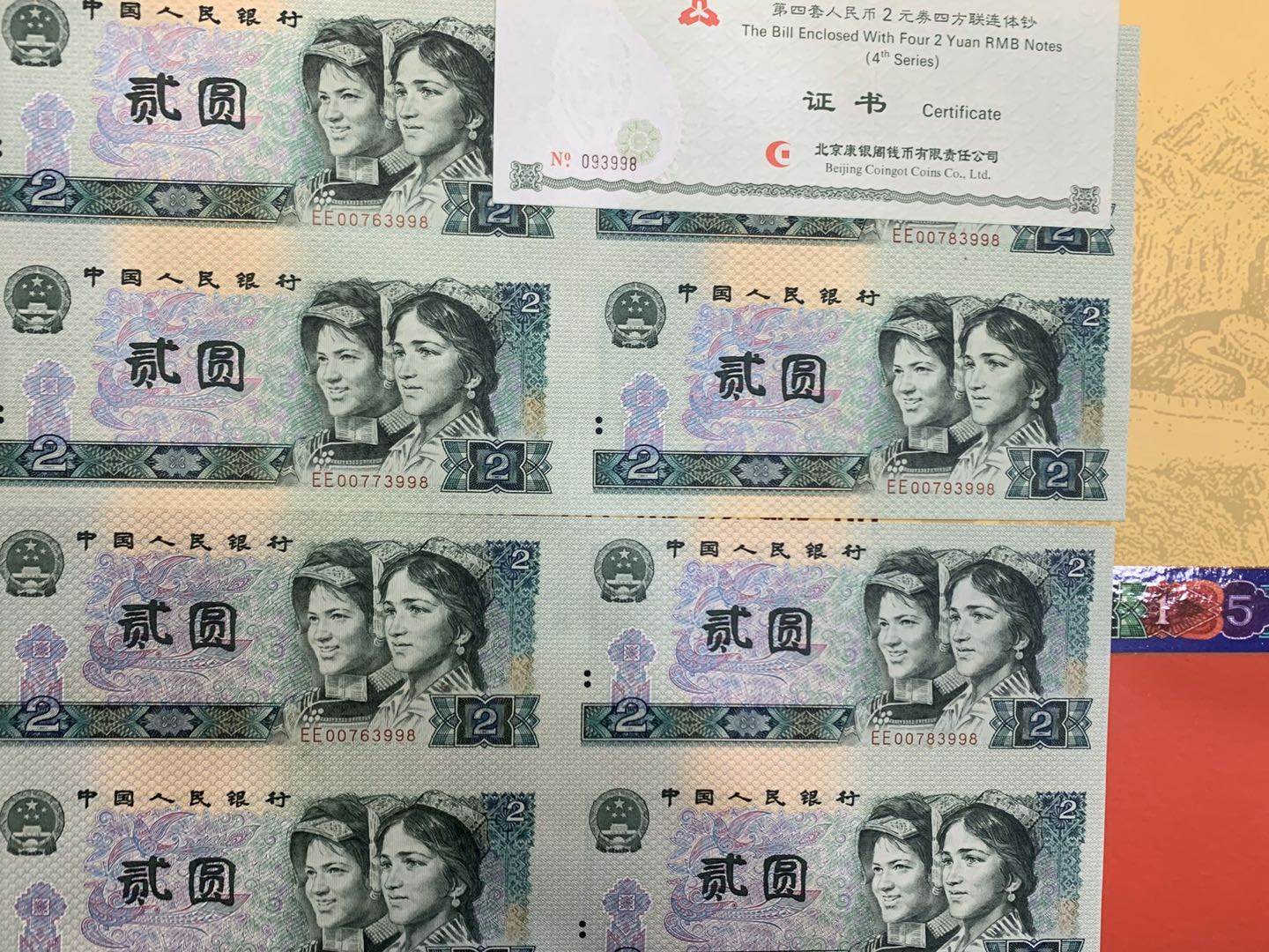 第四套人民幣2元四方連體鈔 8090年一套
