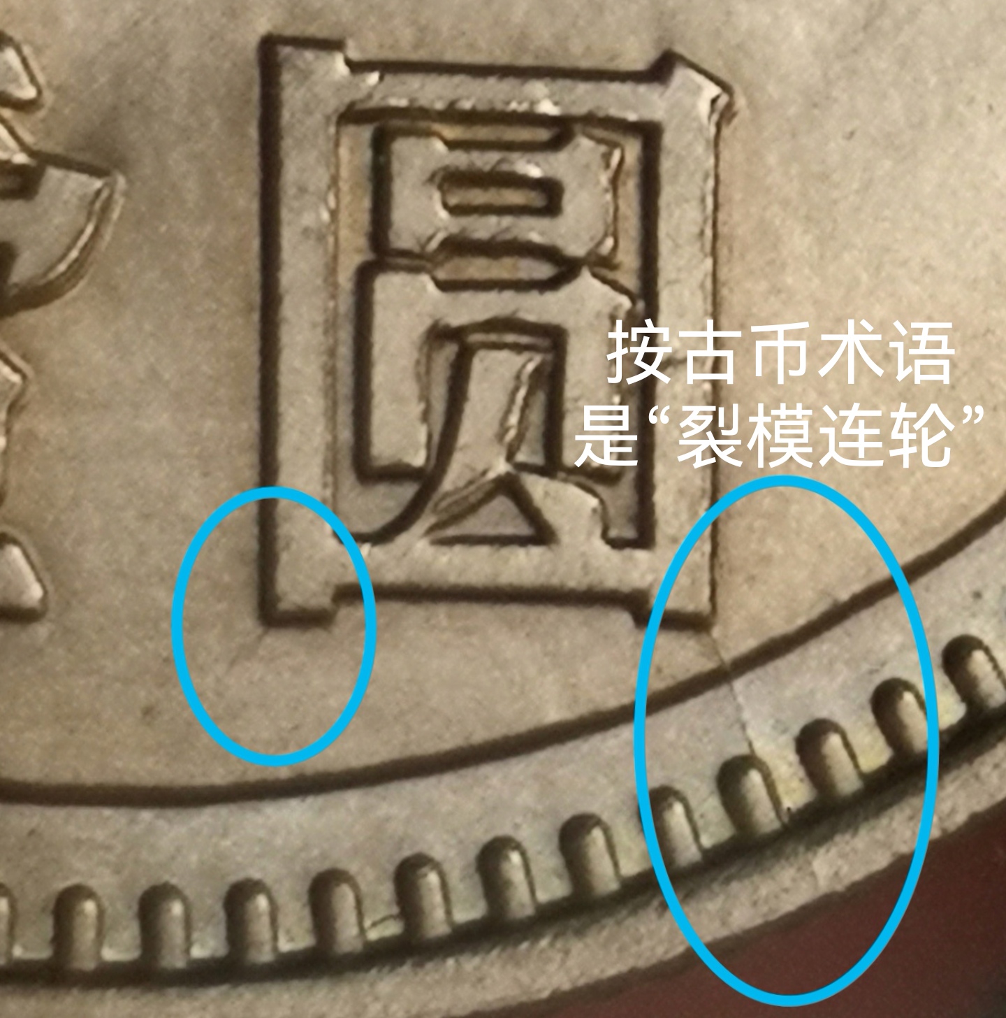 天氣炎熱,在家玩玩錢幣,剛才又發(fā)現(xiàn)“圓”字有兩處裂紋。長(zhǎng)城幣我是小白,但古幣里常有“連輪”,”圓”字兩處裂模紋中有一條是從邊緣開裂,觸及到“圓字”的,