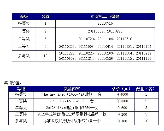 2012年11月3日廣州國標在北京錢博會上對編有2011年生日號的禮品幣進行編號抽獎。其中特等獎一名IPAD3一臺(中獎編號:20110315),兌獎時間截止至11月30日(即明天),目前獎品仍無人前來兌獎。 此編號送出時間為6月8日在廣州維多利酒店舉辦的“2012(廣州)全國金銀幣愛好者聯(lián)誼會”,當時參會人員超過100人,參會人員均獲得儲幣盒一個和禮品幣一枚。現(xiàn)發(fā)帖子尋找此編號的擁有人,或請參加過此會議的朋友們相互告知。(千萬別把幣收入箱底不問世了)