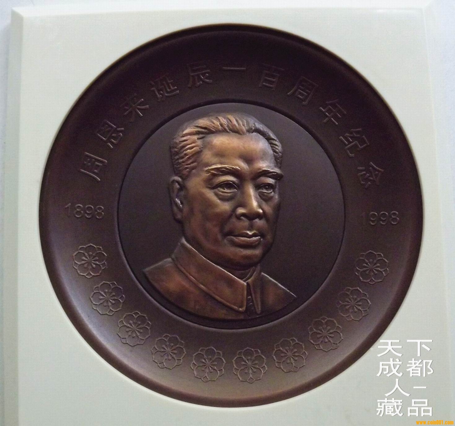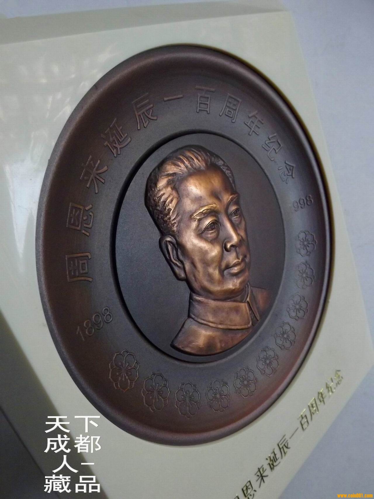 該大銅章紀(jì)念盤正面圖案內(nèi)圓為周恩來頭像,外緣鐫刻主題文字“周恩來誕辰一百周年紀(jì)念1898-1998”字樣,并飾以海棠花圖案10朵,每朵花蕊10枚,象征100周年(周恩來生前最愛海棠花,在他住所中南海西花廳外遍植海棠,并曾以此花遙思鄧大姐)。盤背面鐫刻“中央文獻(xiàn)出版社監(jiān)制,上海造幣廠制”字樣。上幣原淡黃色像框盒精美包裝,配站立支架1個,隨附印有發(fā)行編號鑒定證書1份 。