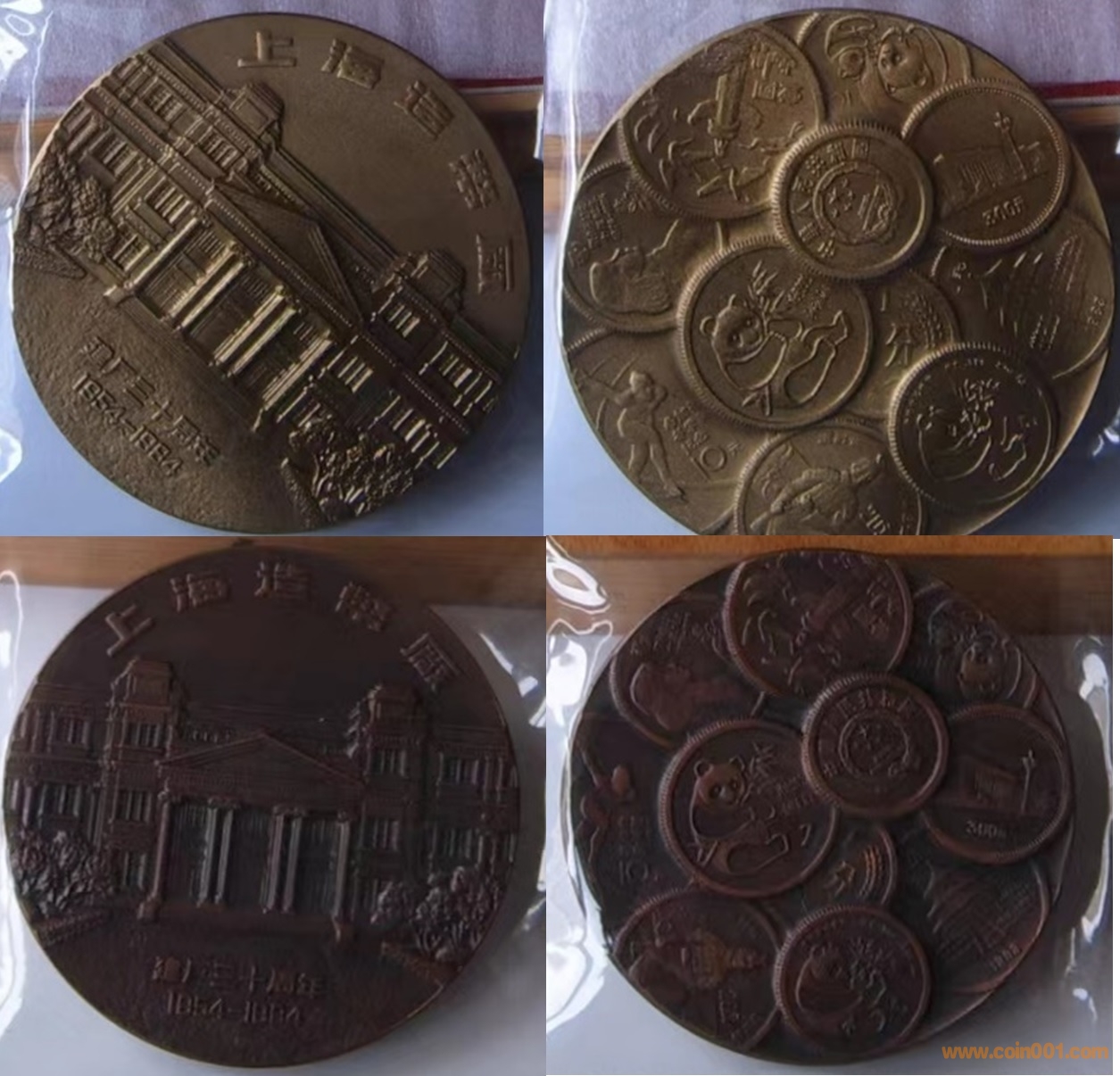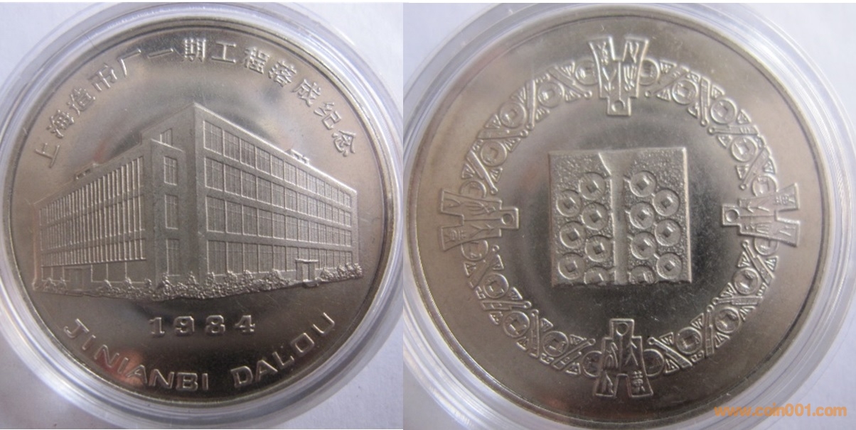 1984年制造,60mm,上幣發(fā)行。正面為上幣大樓,反面為熊貓疊幣、金銀幣疊幣、建三五疊幣以及長(zhǎng)城幣疊幣圖。