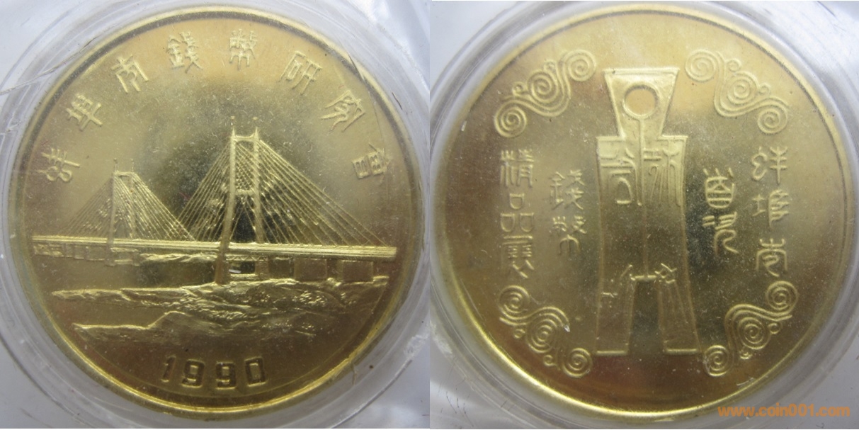 1990年制造,黃銅精制,36mm,上幣發(fā)行。正面為大橋,反面為布幣。