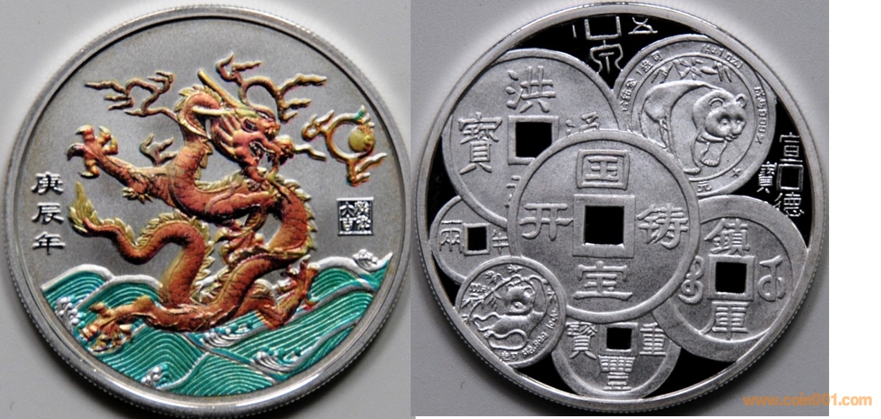 1991年制造,60mm,上幣發(fā)行。正面為長(zhǎng)城,反面為熊貓、天壇等疊幣圖。