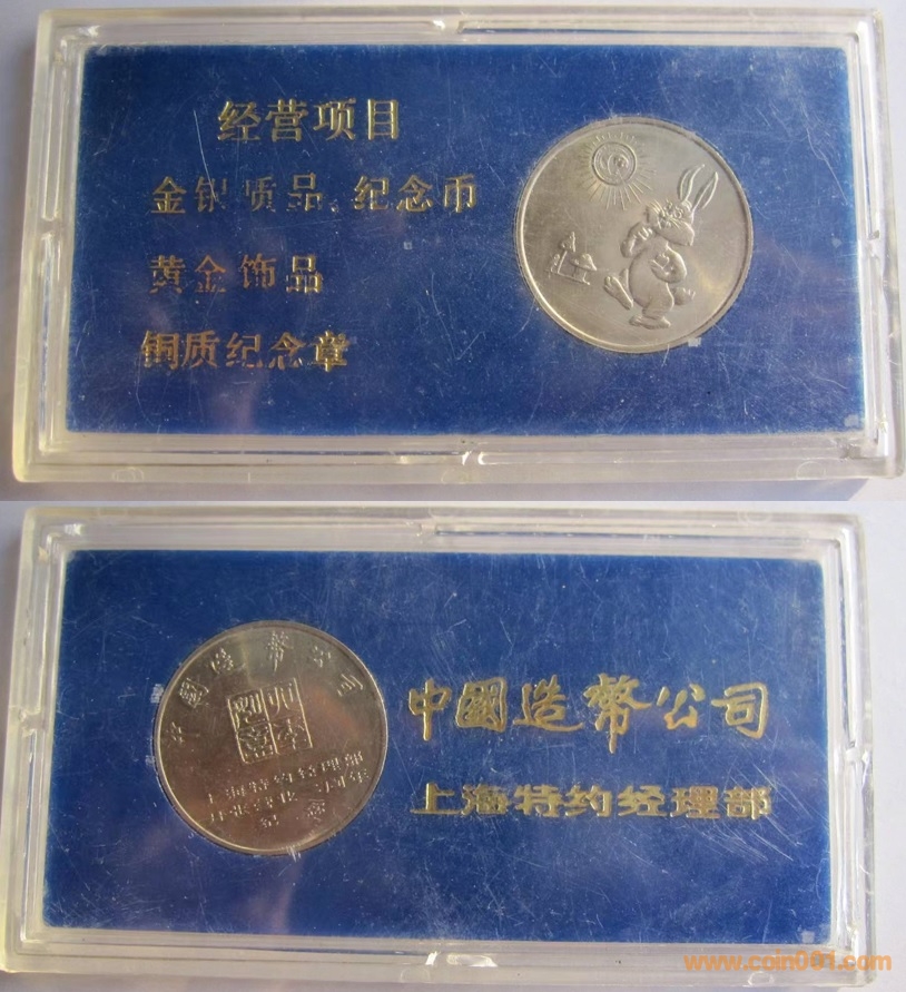 1987年制造,鋼芯鍍鎳30mm,上幣發(fā)行。正面為主題文字,反面為兔子及熊貓疊幣。