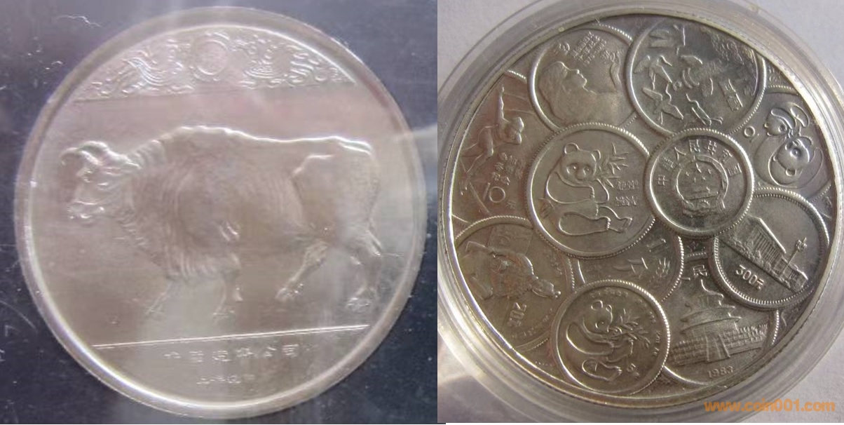 1985年制造,白銅普制,30mm。上幣發(fā)行。正面為牛,反面為熊貓、金銀幣及分幣疊幣圖。