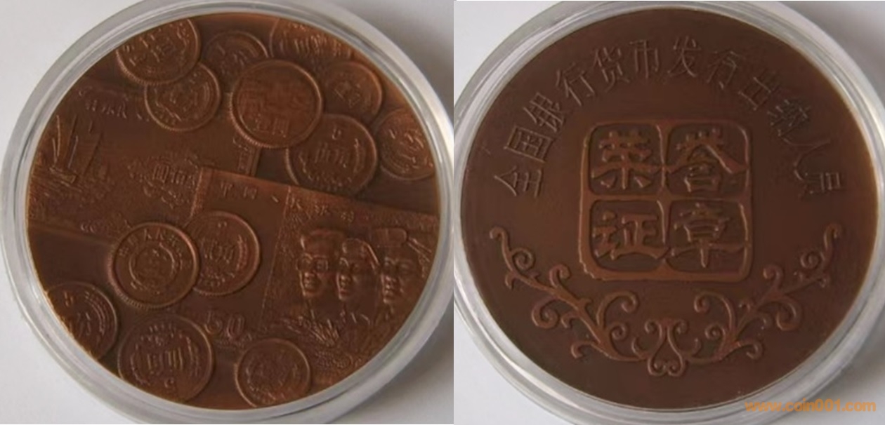 18. 全國(guó)貨幣發(fā)行出納人員榮譽(yù)獎(jiǎng)?wù)拢ā铮?br />90年代制造,60mm紫銅普制,上幣發(fā)行。正面為長(zhǎng)城幣1元,長(zhǎng)城幣2角、長(zhǎng)城幣5角及分幣等疊幣圖,反面為主題文字。