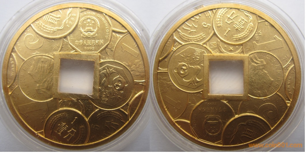1995年制造,33mm上幣發(fā)行。正面為大樓,反面為分幣、角幣及金銀幣疊幣圖。