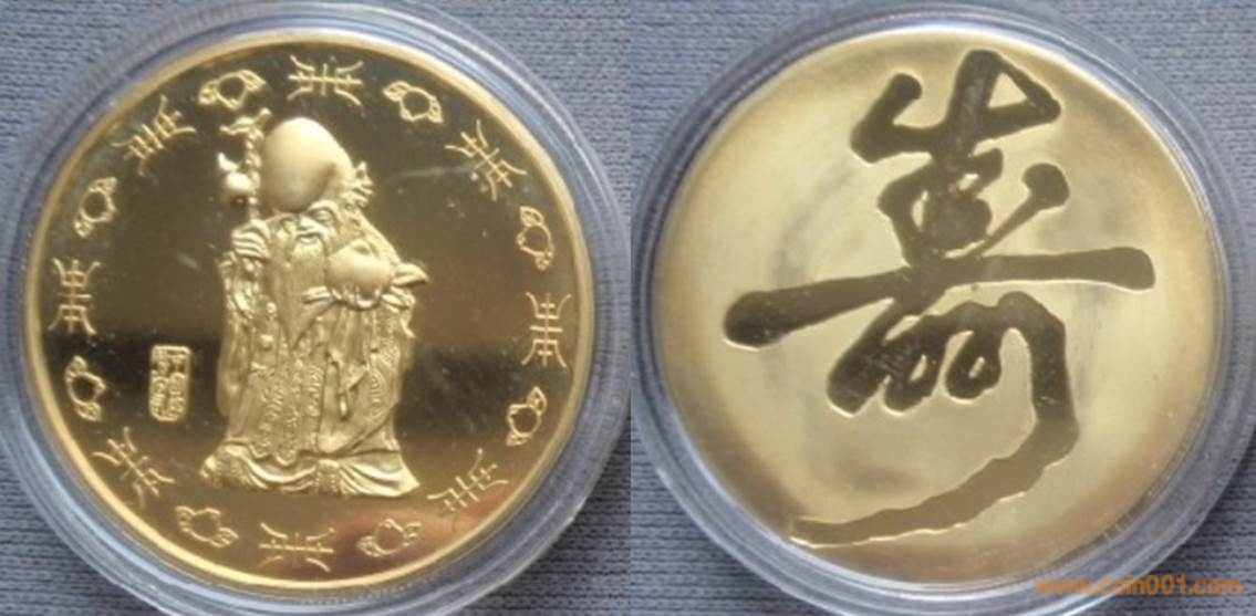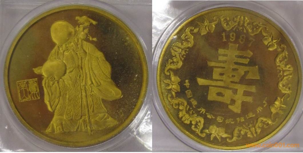 1987年制造,黃銅精制。正面為老壽星,反面為大壽字。帶1987年號與不帶1987年號一樣珍惜。