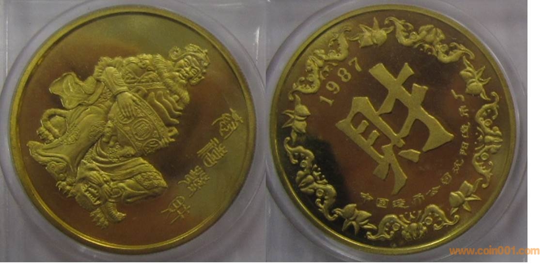 1987年制造,黃銅精制。正面為財神,反面為大財字。帶1987年號與不帶1987年號一樣珍惜。