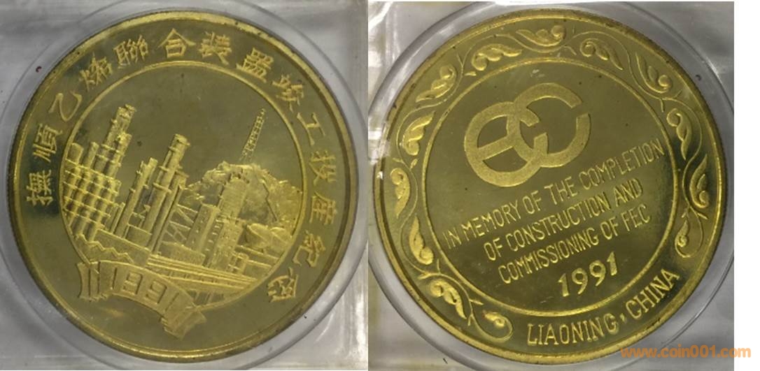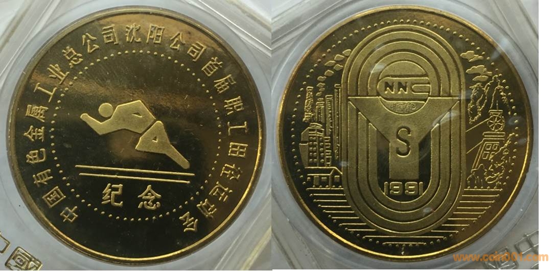 1985年制造,黃銅精制。正面為沈幣廠房,反面為疊幣圖案。此章有鍍金仿品。
