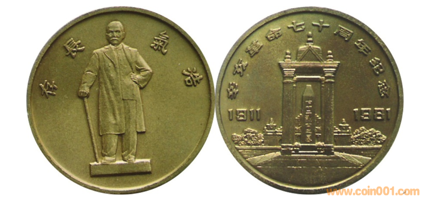 1981年制造,黃銅上色60mm上幣發(fā)行,發(fā)行量10枚內(nèi)。正面為孫中山,反面為黃花崗紀(jì)念碑。