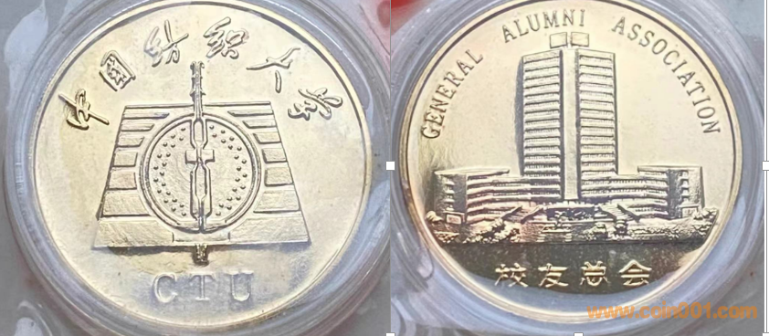 1986年制造,黃銅普制鍍金38.6mm上幣發(fā)行。正面為大樓,反面為紡織大學校徽。