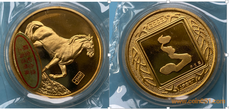 2002年制造,黃銅精制鍍金33mm上幣發(fā)行。正面為馬,反面為馬字。