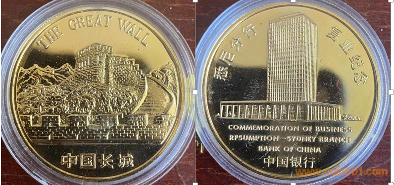 1985年制造,黃銅普制鍍金36mm上幣發(fā)行。正面為中國長城,反面為中國銀行大樓。