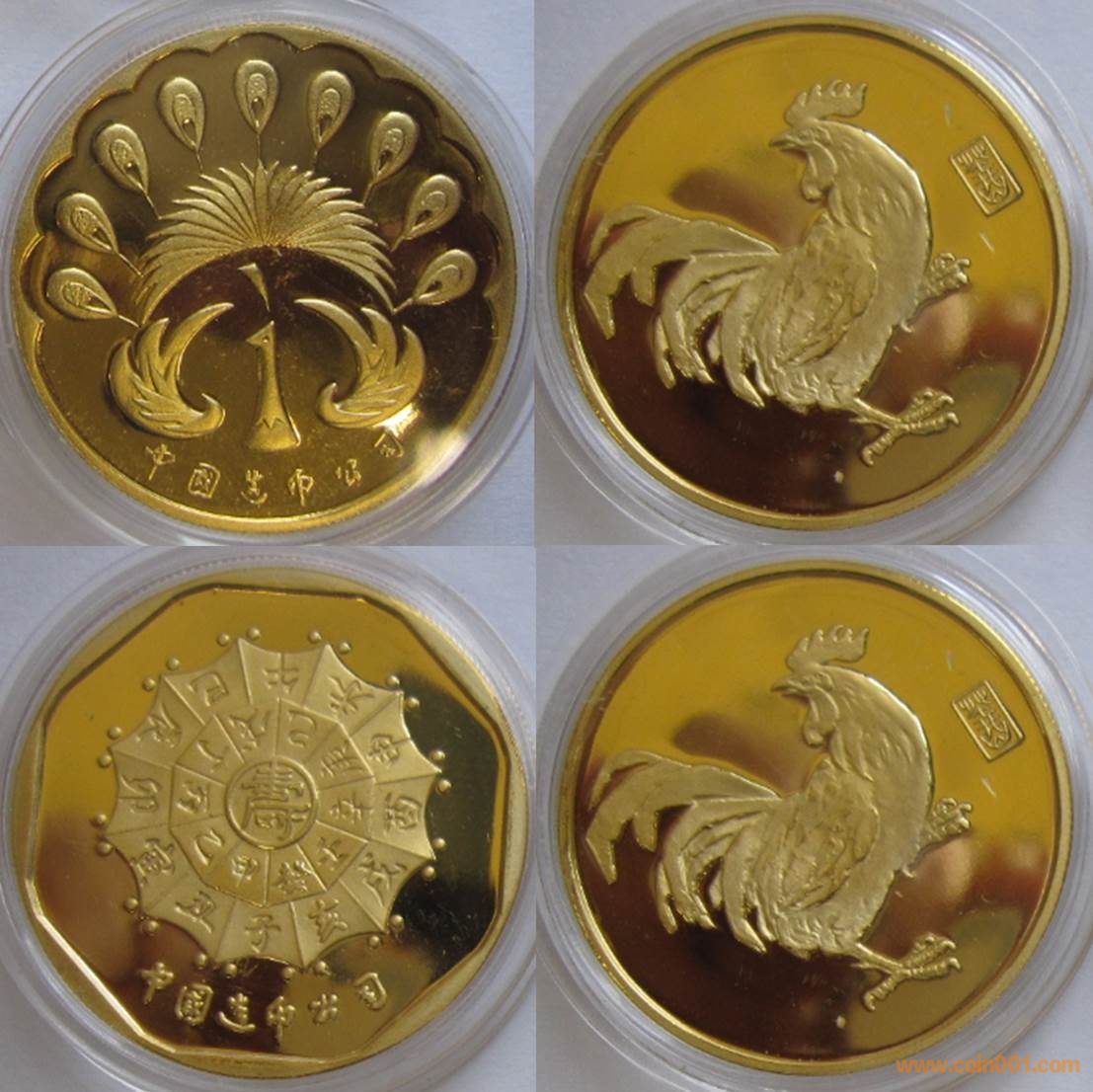 90年代制造,黃銅精制鍍金33mm上幣發(fā)行。正面為雞,反面為天干地支與孔雀。