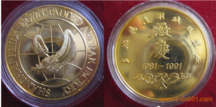 1991年制造,黃銅普制鍍金36mm上幣發(fā)行。正面為羽毛,反面為廠慶文字。